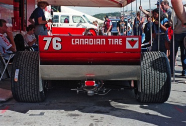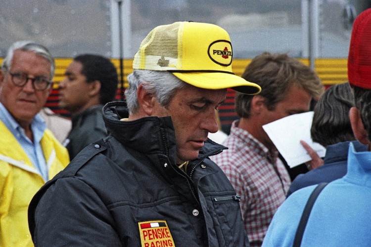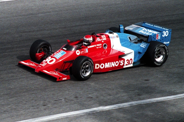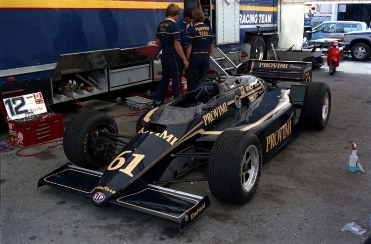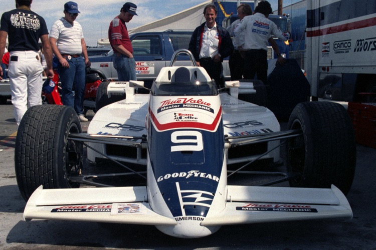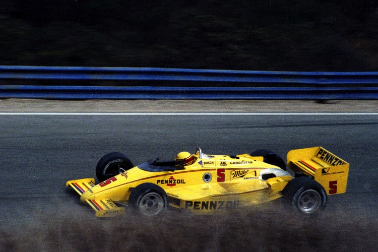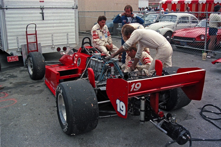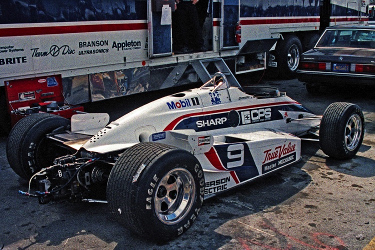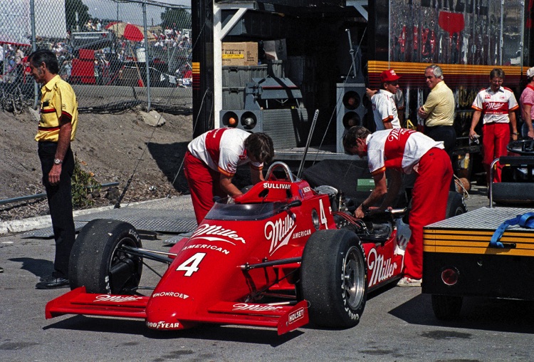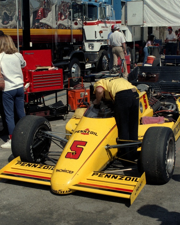 Mechanic working on Al Unser Sr.'s Penske March 85C