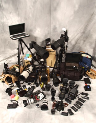 Some of the "Survivors": A Kodak/Nikon DCS 460c with it's original IBM Microdrive from the mid 1990's, my first Nikon D1 from 2000, a Nikon D300, a Nikon D2X with WT-2 wireless transmitter, Canon 5D Mk2, a Canon EOS 1nHS and my original Nikon F3 from the 1980's...